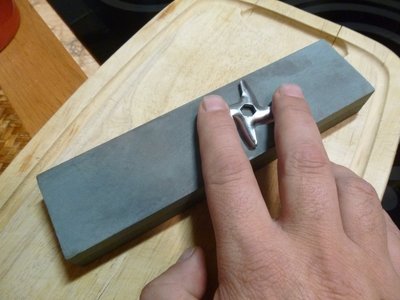 Брусок рекомендуется смочить водой. На кпупнозернистой стороне бруска производится заточка инструмента. На мелкозернистой стороне - доводка инструмента.