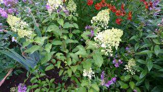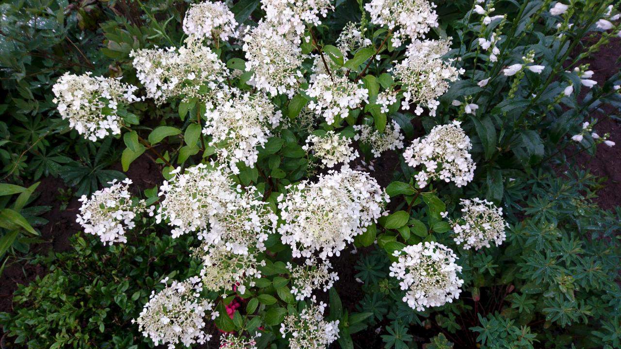 Остальные гортензии все еще цвет набирают.