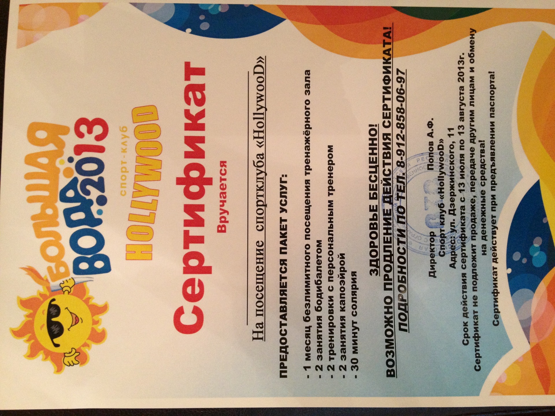 Добрый день. На празднике "Большая вода" в г.Воткинск, я выиграл сертификат на посещение спортклуба HolliwooD .