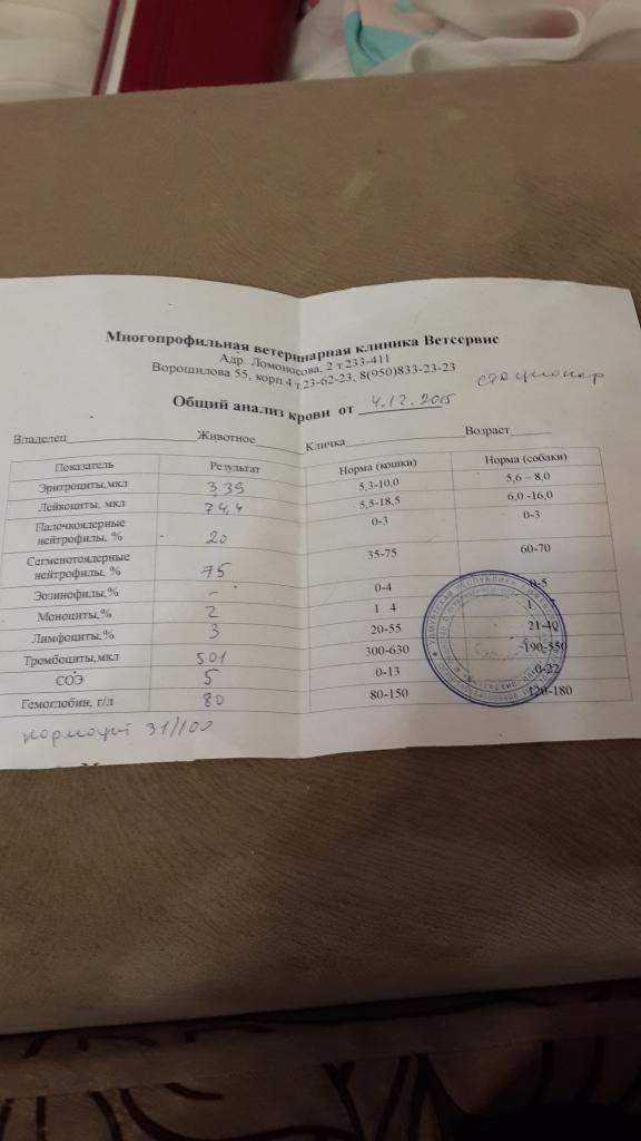 В Ветсервисе сказали - тромб либо бактериальная инфекция, в Биме - нервная форма чумы, Жуйков - какая-то инфекция. Это пока все, что могут сказать. Необходимо повторно сделать общий анализ крови и на повторный прием к Жуйкову.