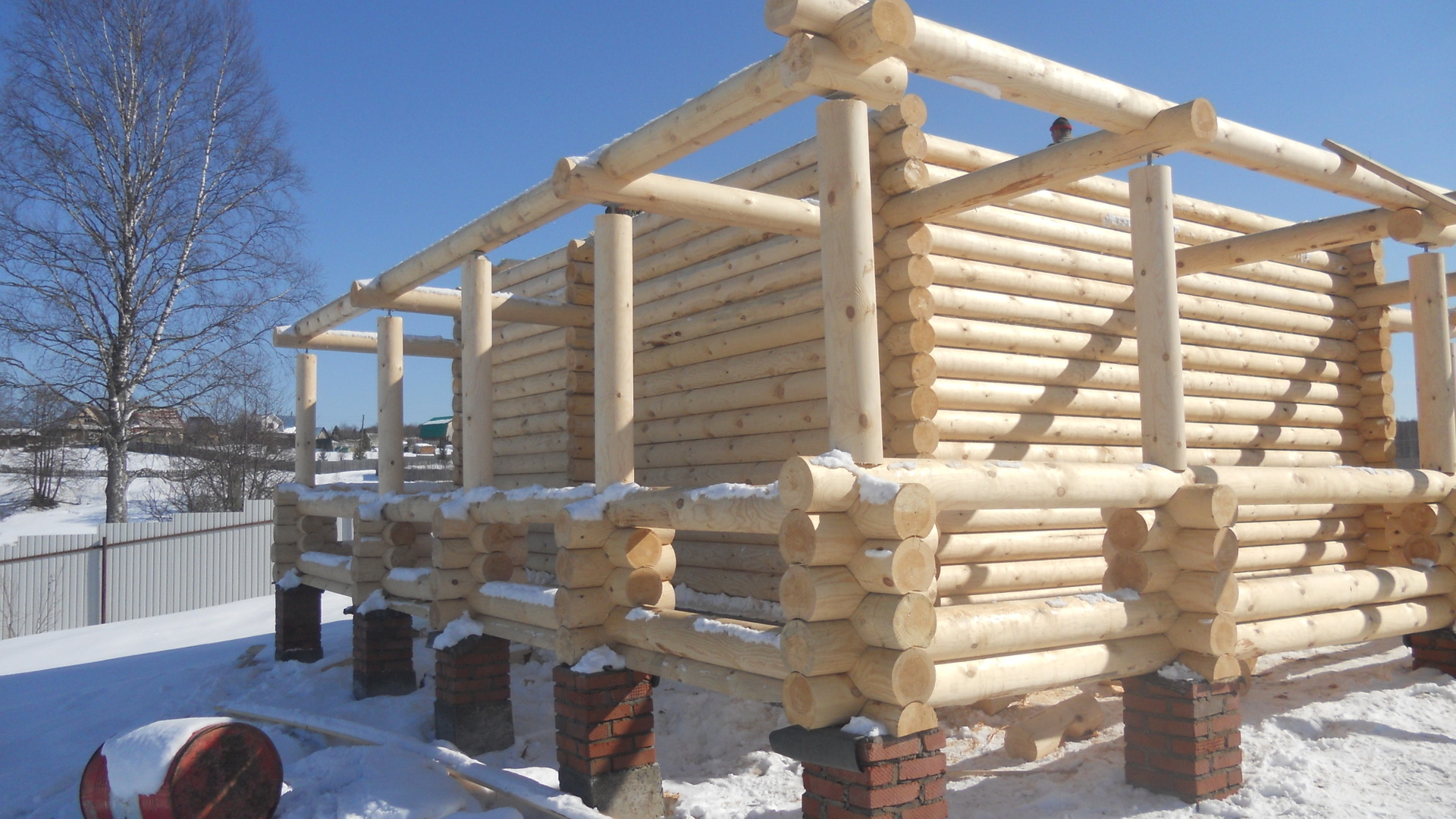 После возведения дома "под крышу" необходимо время на усадку и высыхание бруса (минимум 3 месяцев).
