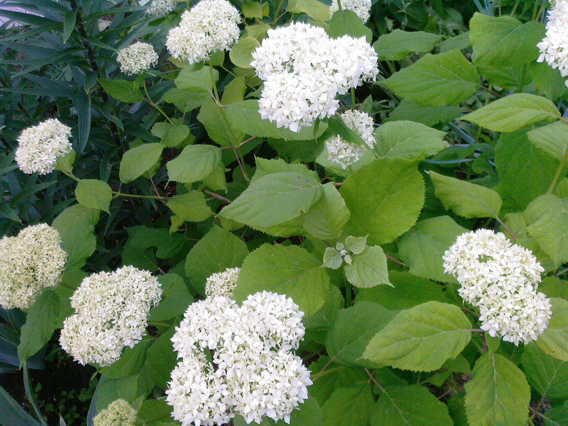 Большая белая шапка это наверное Аннабель, древовидная. У меня в прошлом году она тоже отлично цвела, а в этом ее дерен задавил, она в тени даже еще бутонов не набрала.