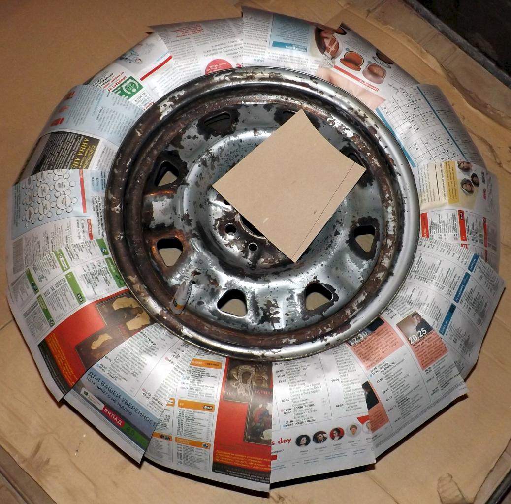 Чтобы не испортить резину во время покраски делаем простой шаблон из картона (+ он самый простой в установке и занимающий немного времени). Край картона придавливаем к краю диска и по нему вырезаем.