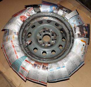 Шаблон прикладываем к газетке "антенна" и т.п. и вырезая по нему получаем много заготовок, которые по одной подкладываем под уже спущенную резину без особых усилий и дополнительных инструментов. На "пимпу" из остатков газеты делаем газетную трубочку и тоже закрываем.: