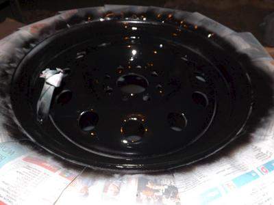 Забегая вперед скажу ГОТОВИМ к покраске ВСЕ 4-е ДИСКА СРАЗУ!!!, так как на 14 радиус покраски одним слоем с одной стороны одного баллончика хватает в притирку. Если делать паузы между покраской и стравливать краску для прочистки баллончика, то ее не хватит на все 4-е диска.
