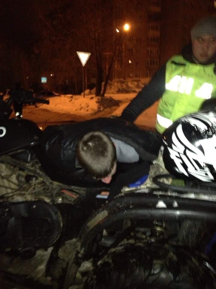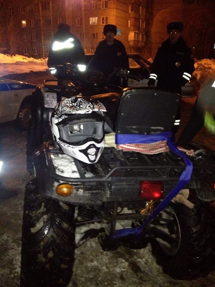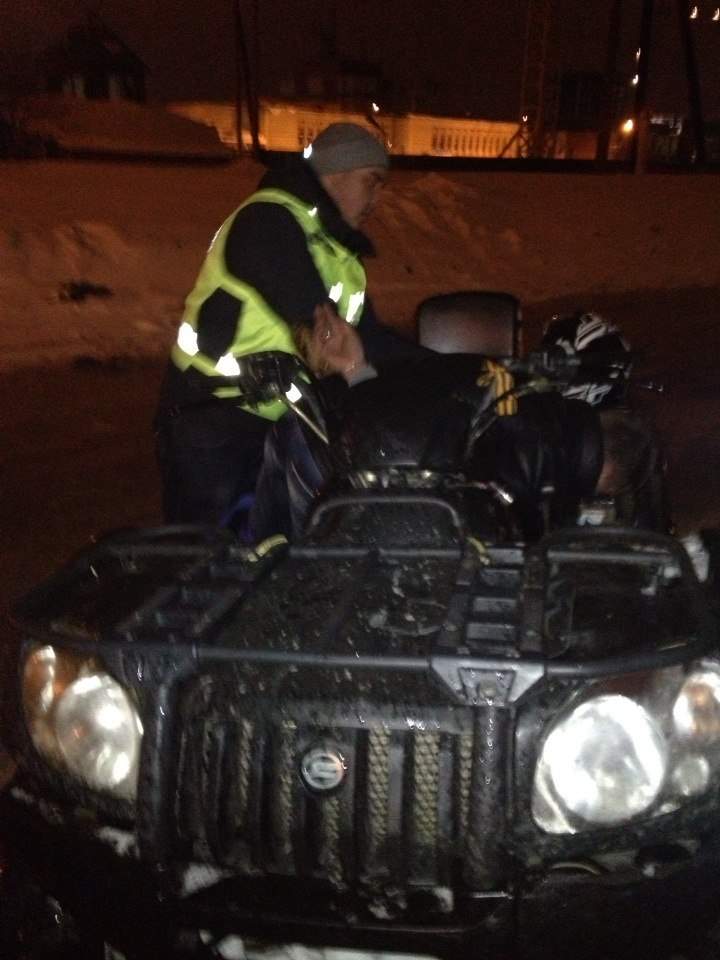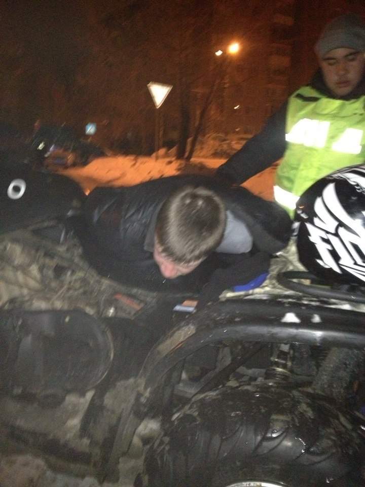 В ночь с 21.02.15 на 22.02.15 в ходе проведении совместных мероприятий ДНД Дорожный Патруль и ОБДПС ГИБДД по выявлению пьяных водителей, сотрудниками ДНД был замечен квадроцикл у ТЦ Кит, который вел себя неадекватно. О данном водителе была передана информация ОБДПС. На квадроцикле было 2 пассажира. Увидев экипаж ДПС водитель попытался скрыться. В итоге непродолжительного преследования водитель был задержан. У водителя не оказалось документов на право управления ТС, так же у водителя присутствовали признаки алкогольного опьянения. При задержании пострадало 3 патрульных автомобиля.