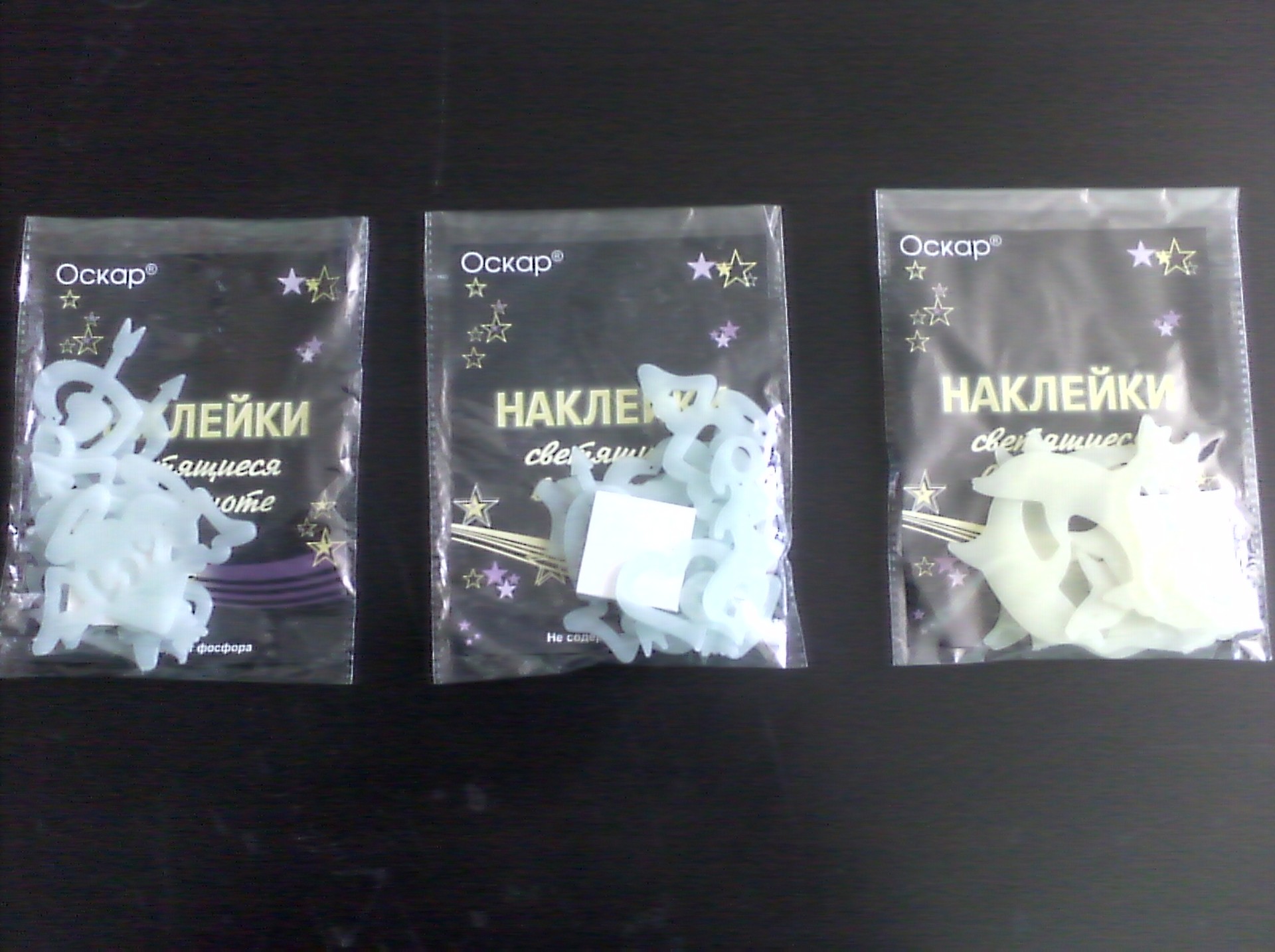 Наклейки имеют форму звезд, планет, месяцев, комет и т. д. Наклейки светятся благодаря составу, способному накапливать любой свет и отдавать его в темноте. наклейки расфасованы в пакеты по 10 шт. и более, в набор входит двухсторонний скотч. Цена - 30 руб. за упаковку.