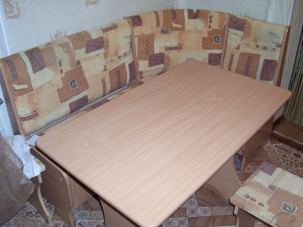 1)кухонный уголок (прямоугльный стол и угловой диван + 2 мягкие табуретки),