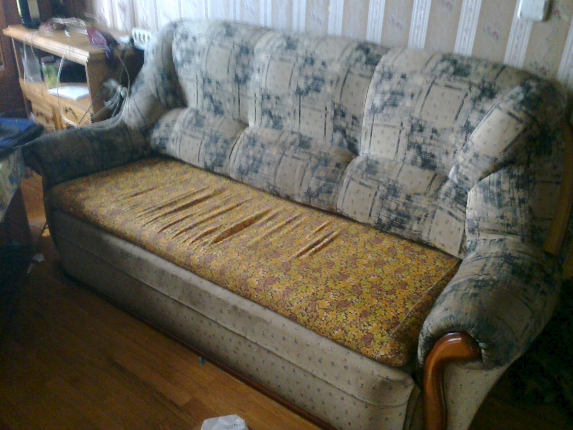 Диван раскладывается. Размеры точно пока сказать не могу. Основа около 2х метров + подлокотники. Самовывоз. Цену предлагайте (в ПМ)