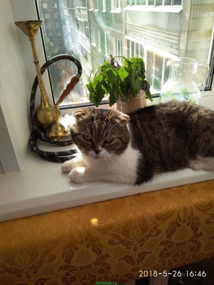 Кот приполз на конюшню в Сарапульском районе. Именно приполз... Задние лапки оказались переломаны по неизвестным нам причинам (машина, человек или просто выпал из окна). Через некоторое время он начал ходить, но до сих пор хромает. Мы решили забрать кота на дальнейшее лечение, ведь на улице породистому и домашнему, да еще и с проблемами не выжить...