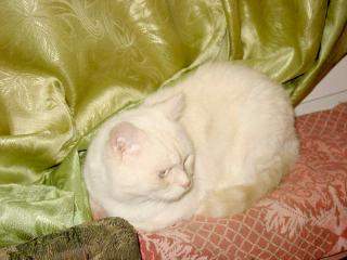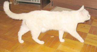 Окрас - белый, немножко рыжеватого, хвост полосато-рыжий, лапы и мордочка немного рыжие . Глаза голубые. Зовут Барсик.