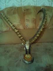 Козел-долгожитель. 32 года!! Хотя встречаются по жизни КОЗЛЫ и значительно старше. А рога красивые. И не дорого.Я себе еще в Ленинграде купил рога благородного оленя с черепом в комиссионке за 18 руб.Решил поменять медальон,а внутри надпись химическим карандашом: "1937г" Во как!