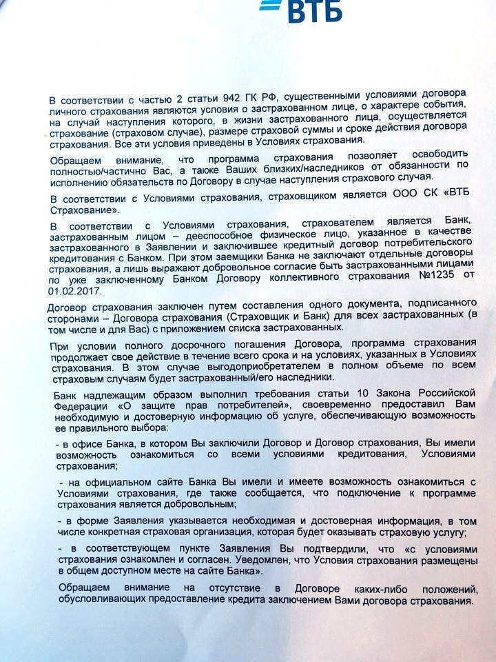 ?? марта был взят кредит в банке ВТБ со страховкой о колективном страховании,