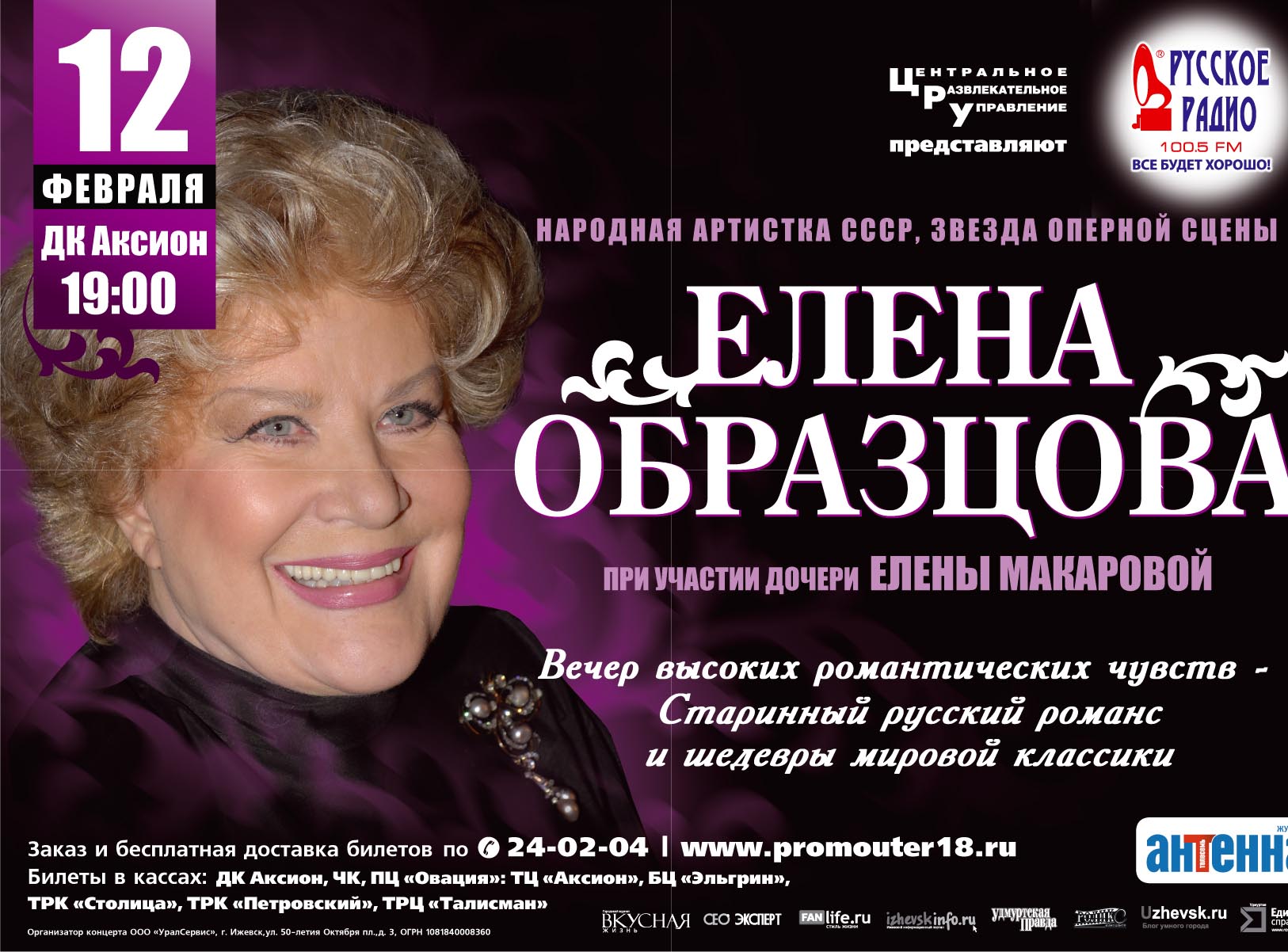 P.S. В Ижевске народная артистка СССР Елена Образцова выступит на сцене ДК <Аксион> 12 февраля. Начало концерта в 19.00. Заказ и бесплатная доставка билетов по тел. 24-02-04 и на сайте www.promouter18.ru .
