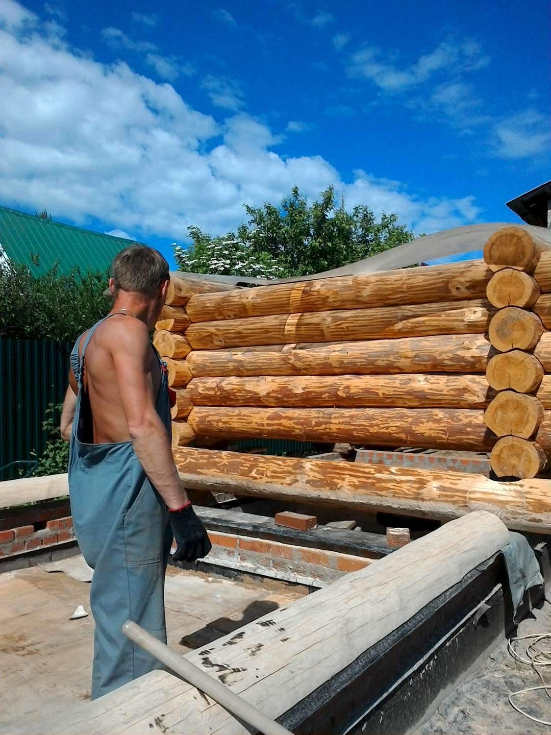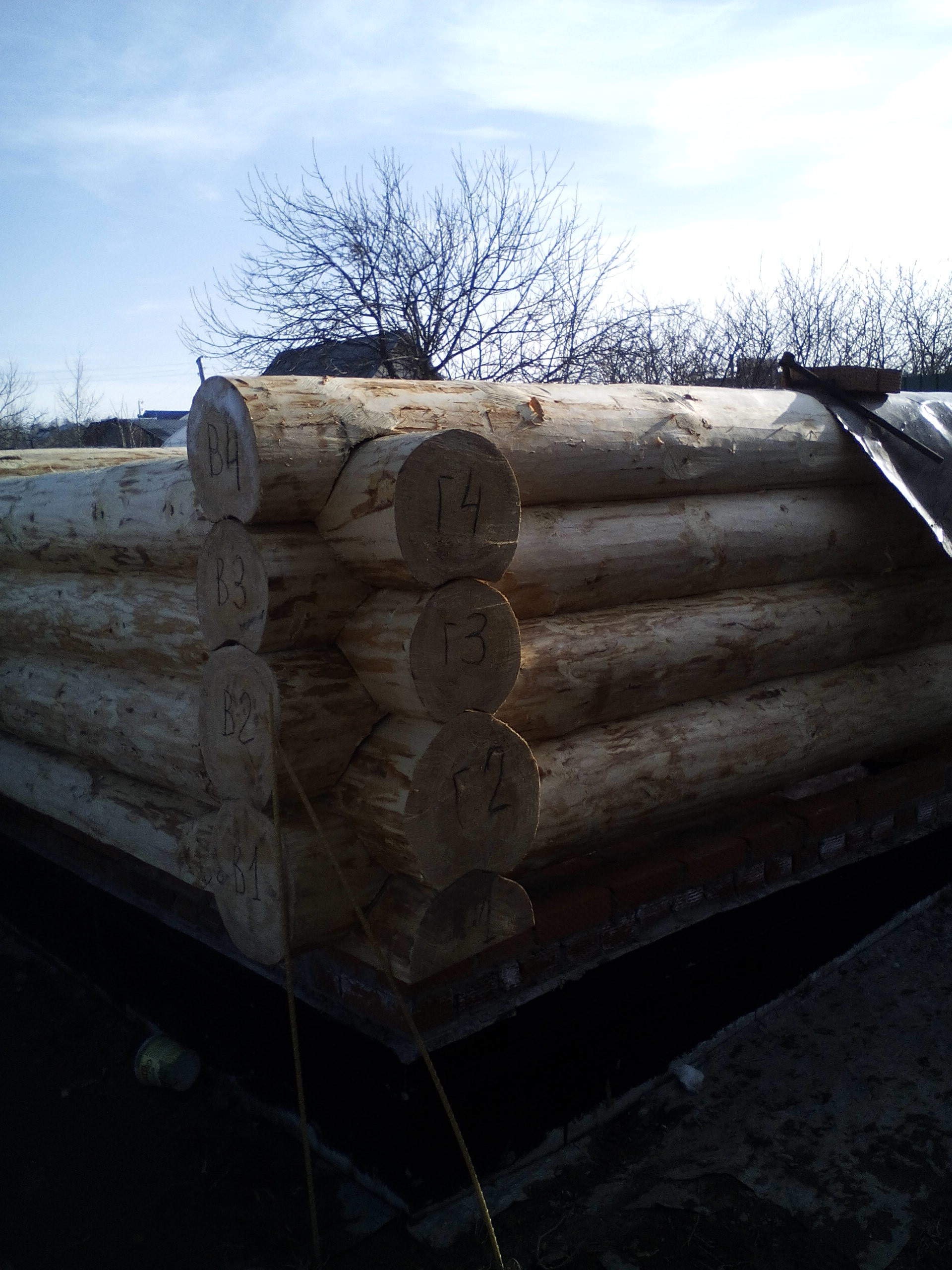 Углы закрывал рубероидом. На фото видно какими были бревна после шлифовки.