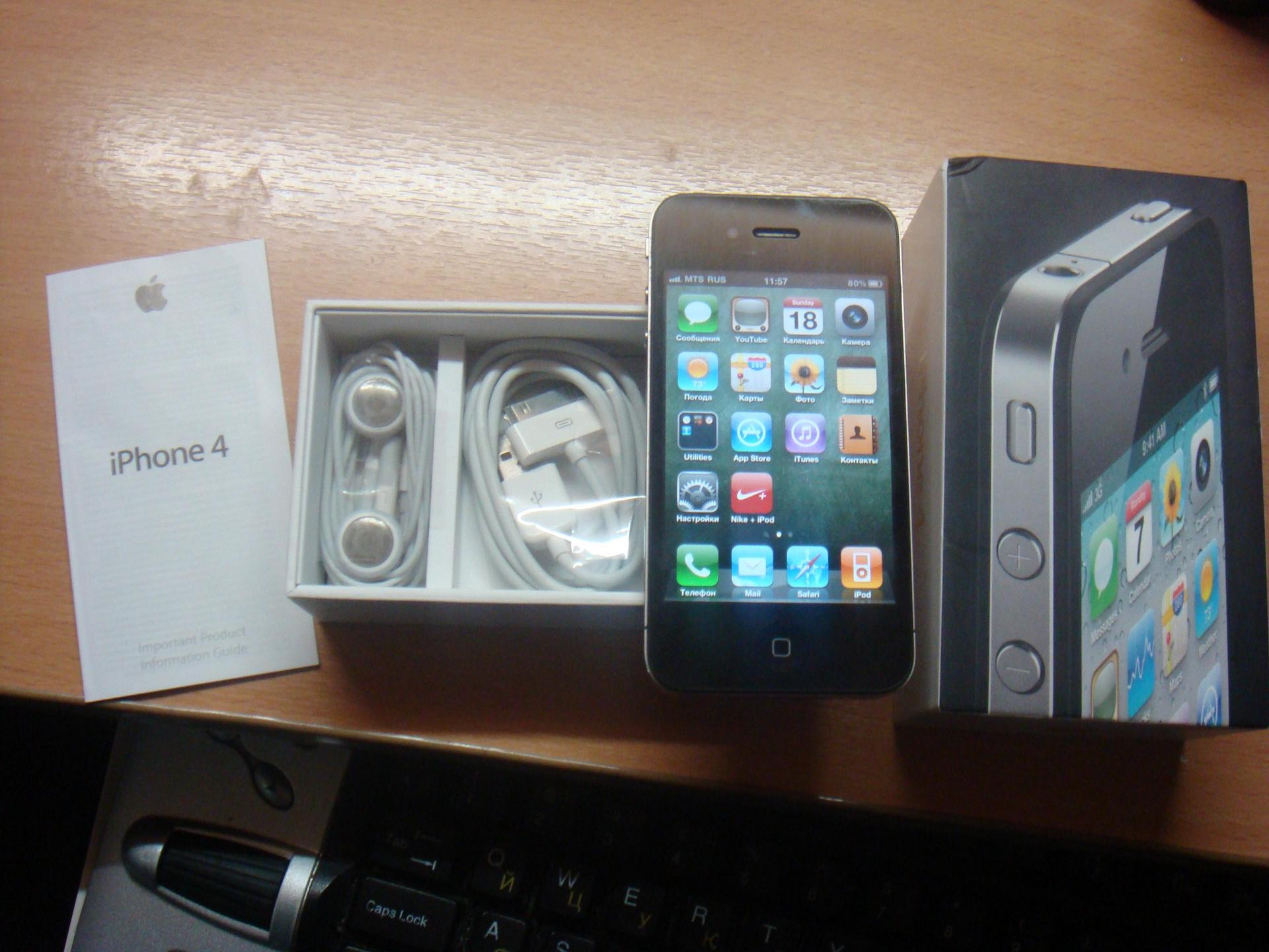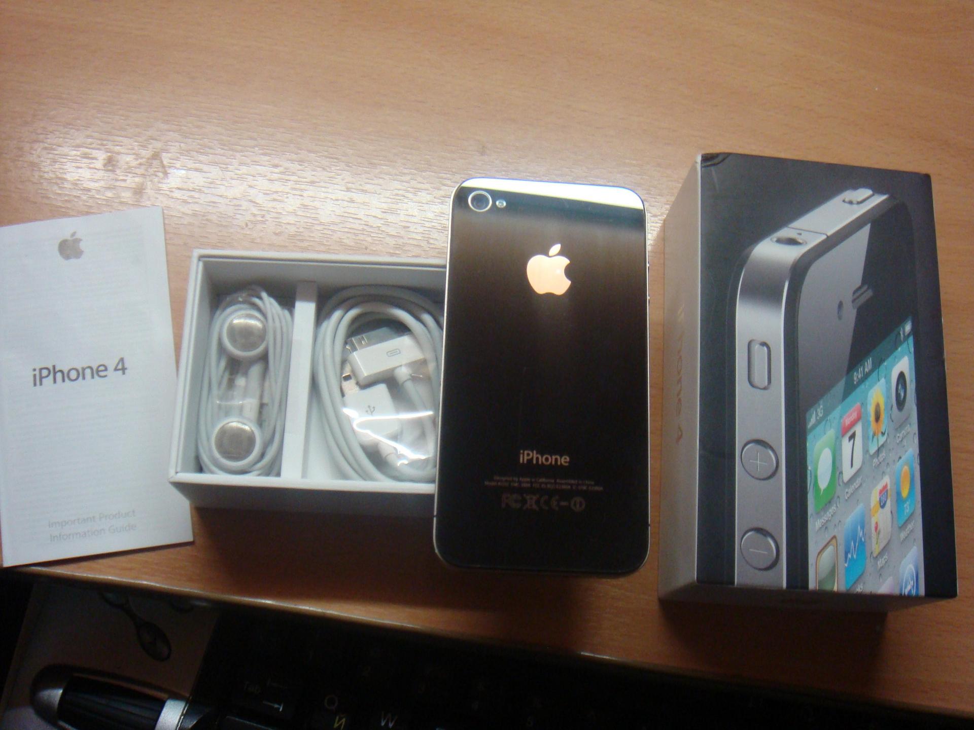 Привет.Продаётся iPhone 4 чёрного цвета,в хорошем состоянии.Установлена прошивка 4.3(могу установить iOS 5.1),модем 04.10.01.Сделан jailbreak(научу вас устанавливать платные приложения бесплатно).Комплект:iPhone 4,кабель,наущники,коробка,инструкции и мануалы.
