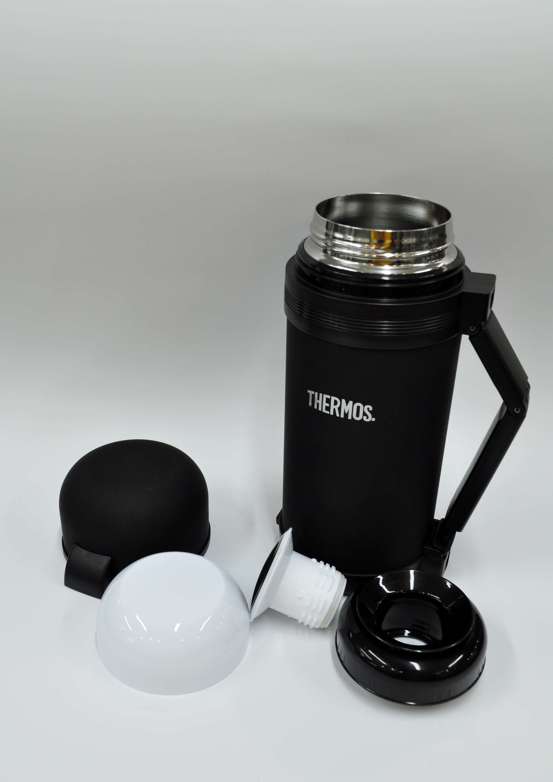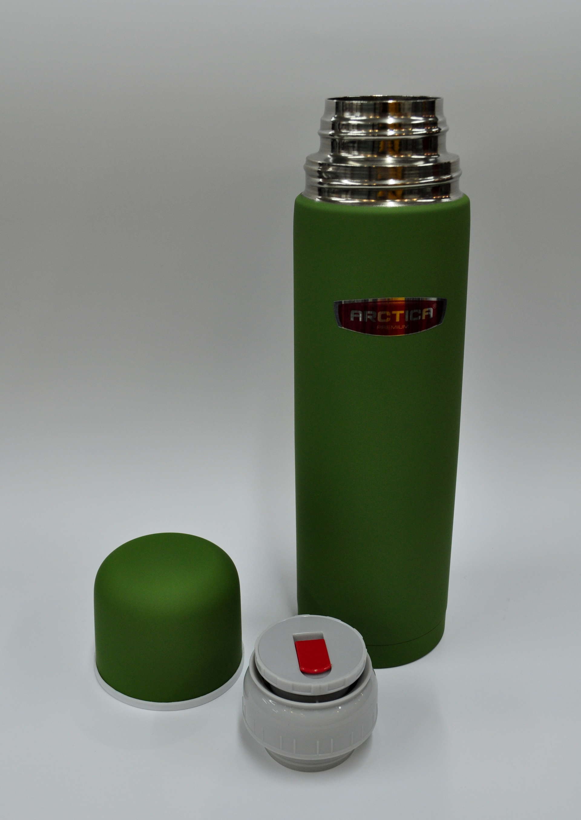 Отличительные особенности - широкое горло (сравнимое по ширине с полноценными "суповыми" термосами), специальное покрытие колбы (аналог тефлона - напитки не приобретают <металлический> привкус, а термос легко отмывается), удобный клапан для наливания напитков, складная резиновая ручка, 2 чашки.