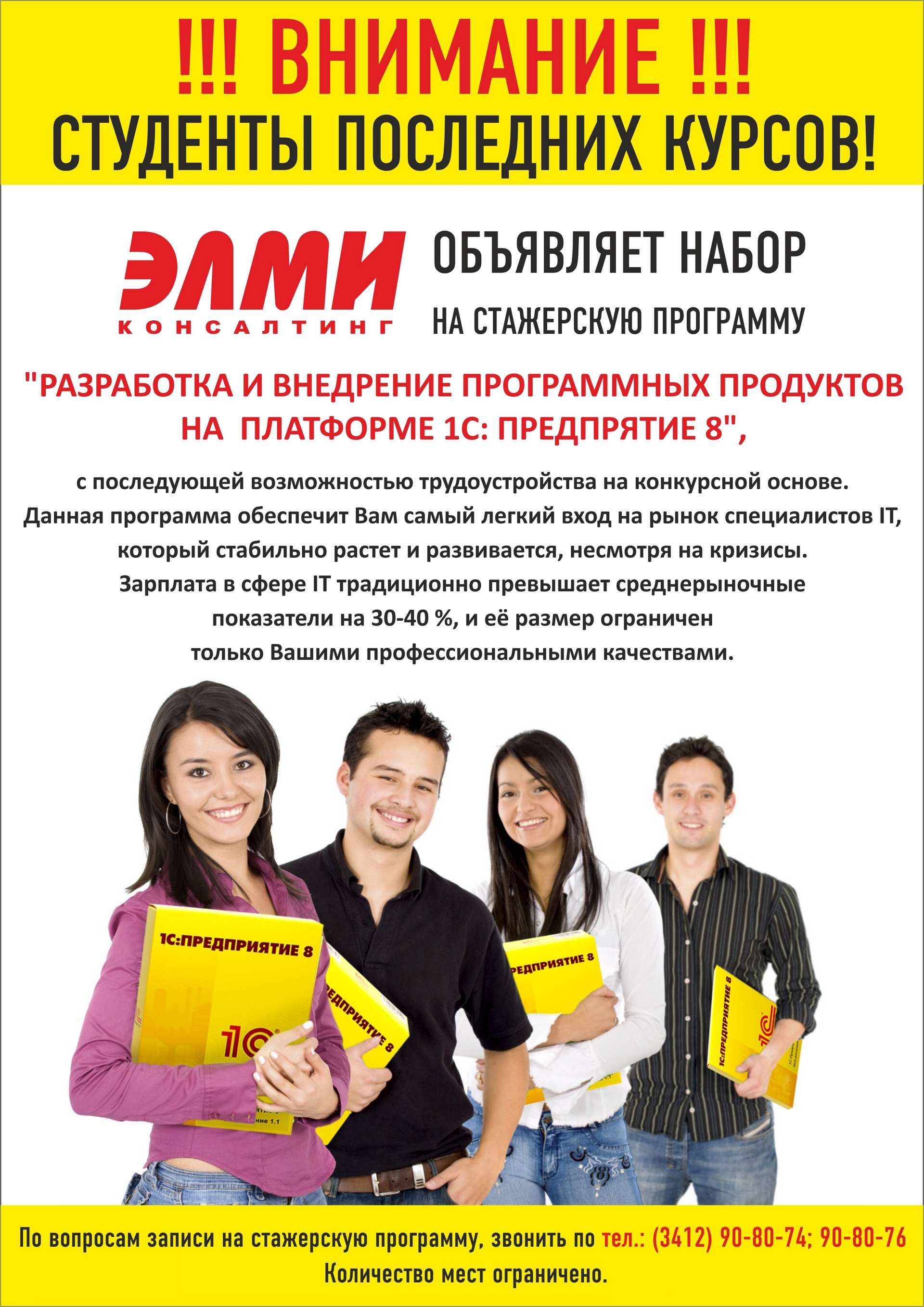 Если Вы заботитесь о своем будущем и всерьез настроены на дальнейшее развитие карьеры, отправьте заявку на участие в программе бесплатного обучения 1С студентов и выпускников по адресу: soft@elmi.ru или звоните по телефону 90-80-74 или 90-80-76, контактное лицо: Донская Ольга.